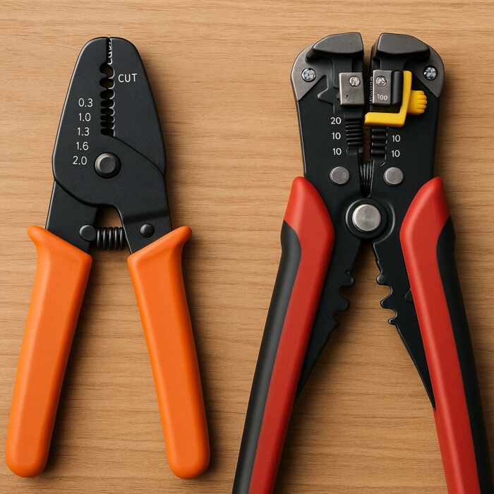 Questi utensili sono dotati di meccanismi più complessi, spesso auto-regolanti: una volta inserito il cavo, la pinza afferra il conduttore, delle lame incidono l’isolante e un sistema meccanico lo rimuove, il tutto con una singola pressione delle impugnature.